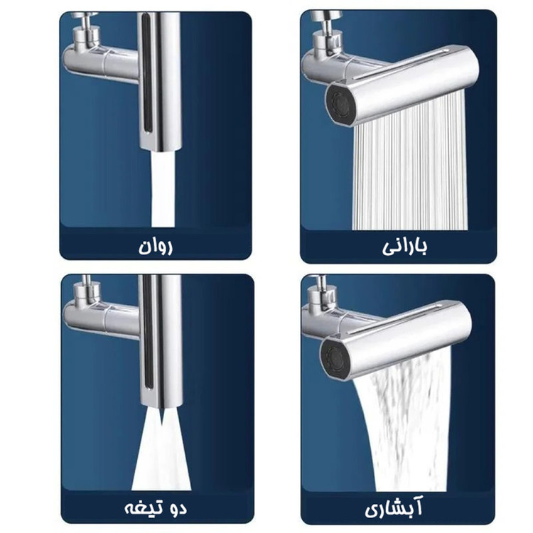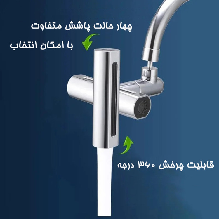 یک وسیله کاربری برای تبدیل شیرآلات به محصول چندکاره مناسب منزل و محل کار می باشد. با استفاده از این سرشیر آبشاری می توانید آب را در 4 حالت صورت فشار شکن و ملایم ، پر فشار ، آبشاری عریض و به صورت بارانی استفاده کنید. سری این سر شیر به صورت 360 درجه قابلیت چرخش دارد. اقلام همراه واشر ضد آب, آچار, تبدیل رزوه داخل به رزوه خارج, رابط اتصال با بست فلزی