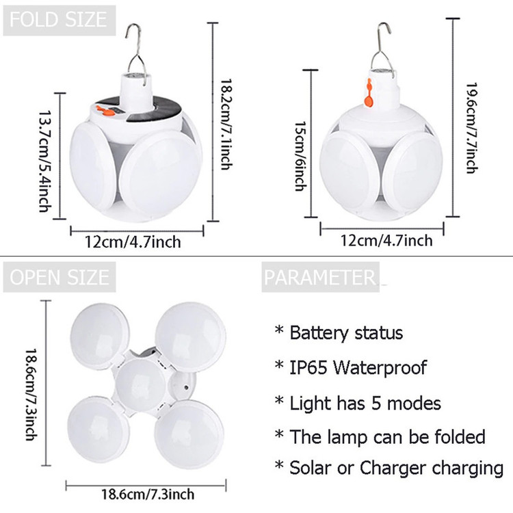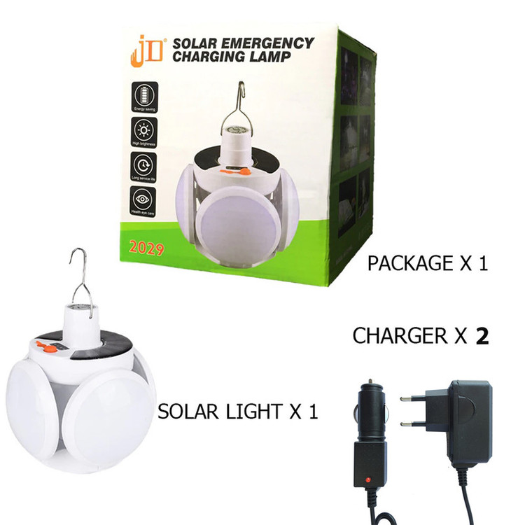 چراغ اضطراری خورشیدی چند حالته مدل CAMP-2029 وسیله ایی مناسب برای سفر و کمپینگ است، جنس بدنه این لامپ از پلاستیک محکم ساخته شده ،و دارای نور بسیار قوی و درخشان می باشد. این کالا دارای 2 شارژر اصلی برای برق و خودرو می باشد. قدرت نور این لامپ 40 وات و به 5 حالت صرفه جوی ،قوی، کم نور و چشمک زن سریع و آرام است که از حالت چشمک زن آن میتوان برای مواقع اضطراری استفاده کرد. لامپ شارژی خورشیدی چند حالته مدل 2029 JD دارای رنگ مهتابی سفید بوده و بعد از شارژ کامل آن، می توان به مدت قدرت 6 تا 10 ساعت از نور آن لذت برد. در بالای لامپ حلقه آویزی برای نصب وجود دارد و به شما این امکان را می دهد تا هر کجا که خواستید نصب کنید.لامپ شارژی خورشیدی مدل CAMP-2029 بسیار زیبا و خوش حالت طراحی شده است به طوریکه شما می توانید هم به حالت بسته از آن استفاده کنید که در این صورت شکل توپی گرد به خود می گیرد و هم می توانید آن را کاملاً باز کنید و پخش نور آن بیشتر می شود و می تواند محیط گسترده تری را نورانی کند. از ویژگی های دیگر این لامپ داشتن صفحه سولار می باشد و این خود می تواند بهترین کمک را در در ذخیره انرژی داشته باشد، همچنین دارای میزان روشنایی 800 لومن و چراغ نشانگر شارژ در قسمت بالای لامپ نیز می باشد.منبع تغذیه لامپ توسط پنل خورشیدی و همچنین آداپتور می باشد. برای شارژ کامل لامپ، 5 ساعت زمان لازم است و با هر بار شارژ کامل، می توانید به مد ت 6 تا 10 ساعت از نور آن استفاده کنید.