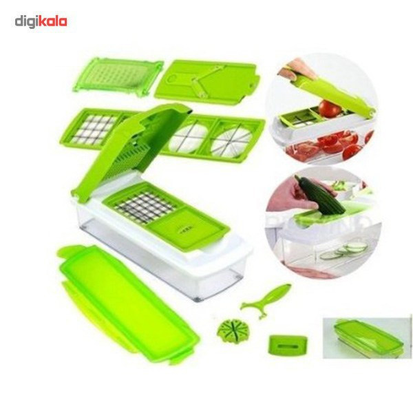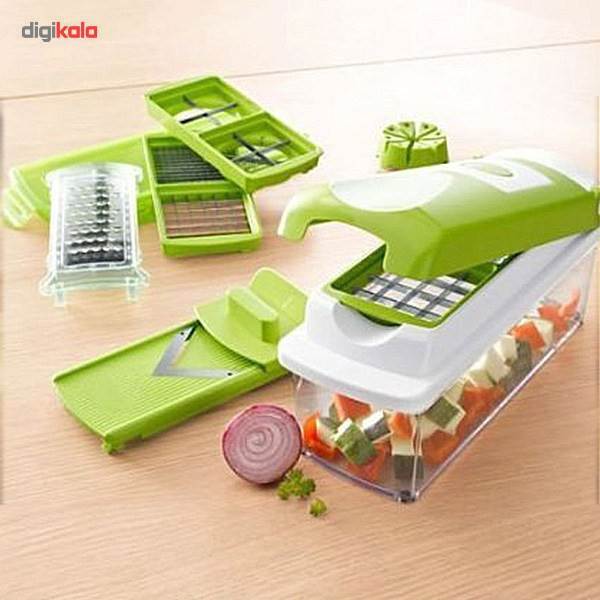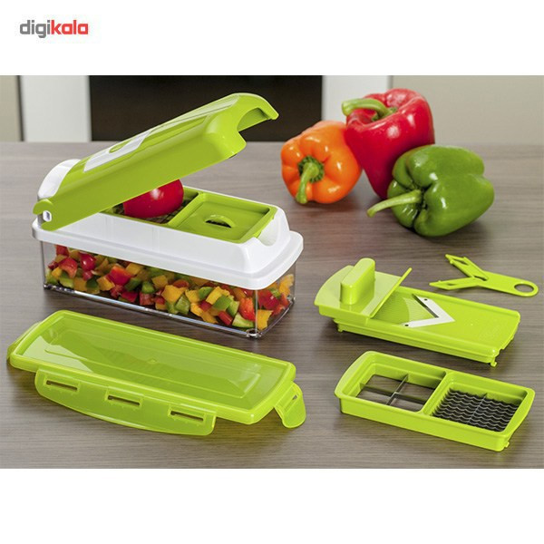 شما هم حرکت سریع دستان سرآشپزهای حرفهای را هنگام قطعهقطعه کردن میوه و سبزیجات با چاقوهای بسیار تیز دیدهاید. تقریبا همهی ما برای یک بار هم که شده، تلاش کردهایم تا این کار مهیج را امتحان کنیم و البته شاهد نتایج دلخراشی بودهایم. مسلما آشپزهای حرفهای، برای انجام این کار، سالهای زیادی تمرین کردهاند تا یاد گرفتهاند چگونه بدون صدمه زدن به دستانشان با سرعت خیلی زیاد، میوه و سبزیجات را به قطعات کاملاً هماندازه، گاهی خیلی ریز و نازک و گاهی درشت تقسیم کنند. نایسر دایسر پلاس Nicer Dicer Plus وسیلهای چندکاره است. این وسیله این امکان را فراهم میکند تا شما بتوانید پیاز، گوجهفرنگی، خیار و سایر موادغذایی را در زمانی کوتاه و بهراحتی، در اندازههای دلخواهتان خرد کنید. همچنین با استفاده از تیغههای تیز این غذاساز میتوانید در هر ثانیه، چندین برش با شکلهای متفاوت انجام دهید. این غذاساز دارای یک رندهی تیز دارای روکش و یک پوستکن با دستهی ارگونومیک است که شرایط پوست کندن را آسانتر میکند. به محتویات این غذاساز میتوان ظرف دردار آن را اضافه کرد که از جنس پلی کربنیک است. این ظرف ضد خش، لکه و ضربه بوده و برای ذخیره کردن مواد غذایی خردشده در یخچال و فریزر مناسب است. امکان شستوشوی این ظرف با ماشین ظرفشویی وجود دارد. این غذاساز یک بستهی کامل شامل خردکن، لهکن، پوستکن و رنده به همراه یک ظرف دردار ذخیرهسازی است که تمام کارهای یک سرآشپز را برای آمادهسازی موادغذایی قبل از طبخ غذا، در کمترین زمان ممکن و امنترین روش انجام میدهد.